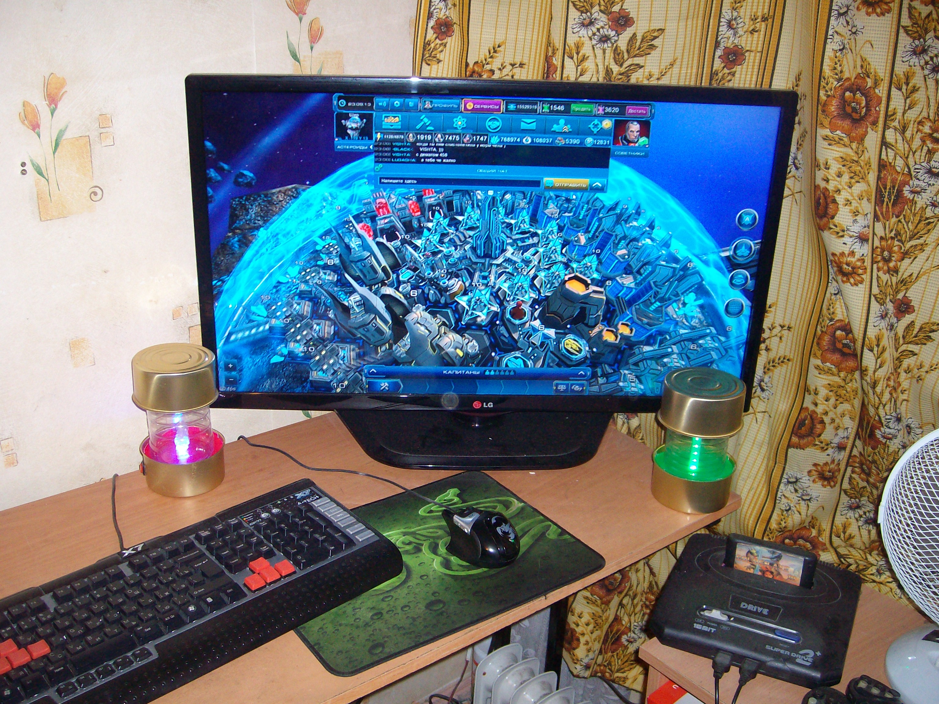 На первом фото мое игровое место, по краям хэнд мэйд светильники "Тритий" и "Дейтерий". Далее идет фото их с близкого расстояния. На третьем фото включена зеленая подсветка комнаты, ощущения как будто находишься в тритиевом облаке. И последнее фото фото с улицы с включенной зеленой подсветкой.