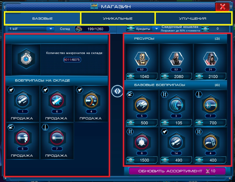 Магазин предназначен для покупки кредитов, кристаллов, микрочипов, боеприпасов (ракеты, лазеры, конструкции и дроны), миниботов, офицеров, артефактов, рун, контрактов и наборов.