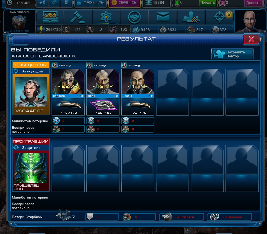 negadiaj писал(а):Такая же ситуация, отправил вчера генерала на грабеж, вернулся с поражением, правда миниботы все потерял, посмотрел запись боя - мой генерал танцевал польку бабочку вокруг базы пришельцев и ждал, когда же его наконец убьют)))) При этом стрелять ему видимо религия не позволяла - не сделал ни одного выстрела :cry: Почему я не мог управлять боем и собственно - почему генерал не использовал лазеры и ракеты?