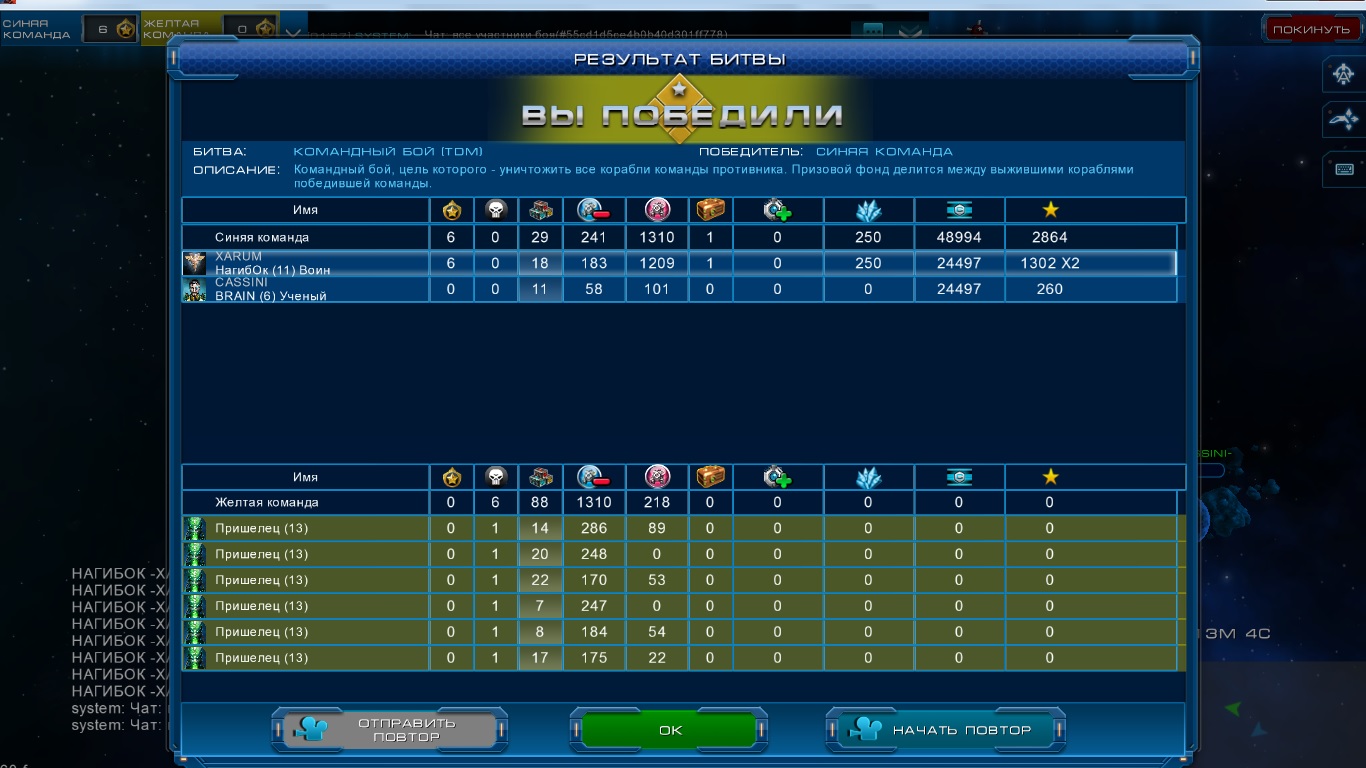 Причем зашли сразу в 2м и просто вмсятку команду пришельцев :) - реплей есть :) - я понял ученик перспективный, 100 хп кораблик и так по-боевому :). Но затишье - на арене крутиться босс 29 и 46 уровней еще час - а делать нечего. И тут, думаю какая разница у меня есть супер защитник 45 - главное координация - недолгие приготовление в скайпе (ученик кстати набрал на все свои 20 боезапаса - щитов и барьеров :). И: